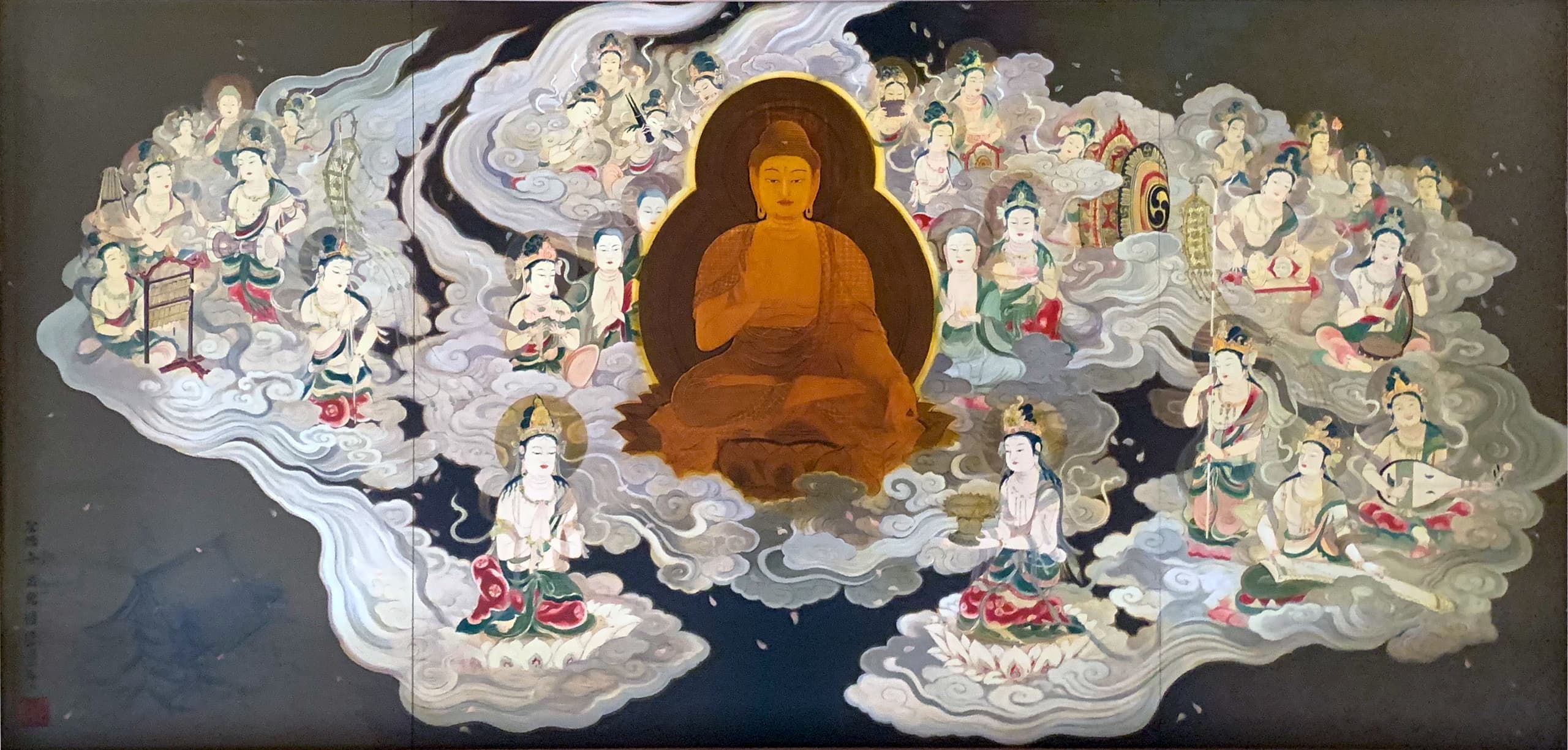 真言宗は仏教の1つの宗派であり、仏法僧つまり、仏陀である釈尊(仏)と、釈尊の説いた教え(法)と、その教えを守る僧侶の社会としての仏教教団(僧)という三宝に帰依することを説くのは、他の宗派と同じです。しかし、真言宗の場合の仏とは大日如来をさします。 したがって、法とはその大日如来の説いた教えであり、僧とはその教えを広めようとしている人々であります。釈尊は教えを説く相手の能力に応じて方便をもって説いたといわれますが、大日如来は方便を用いないで、真実の言葉で、悟りの境地をそのまま説いたのです。この点が真言宗の特色です。